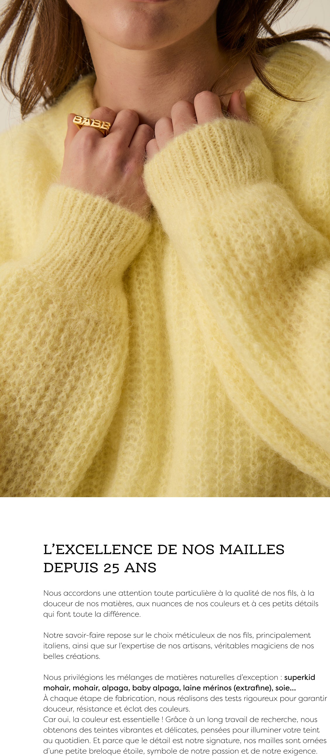 Si vous en prenez soin, elle vous accompagnera longtemps (presque toute une vie !) avec douceur et élégance.Dans ce petit guide, découvrez l’origine et les particularités de votre maille, et aussi nos conseils d’entretien pour la garder belle au fil du temps.
