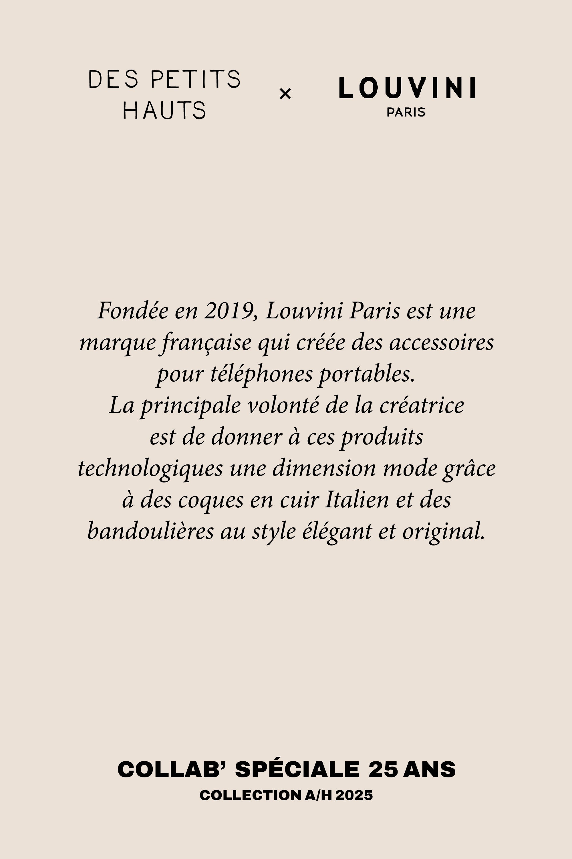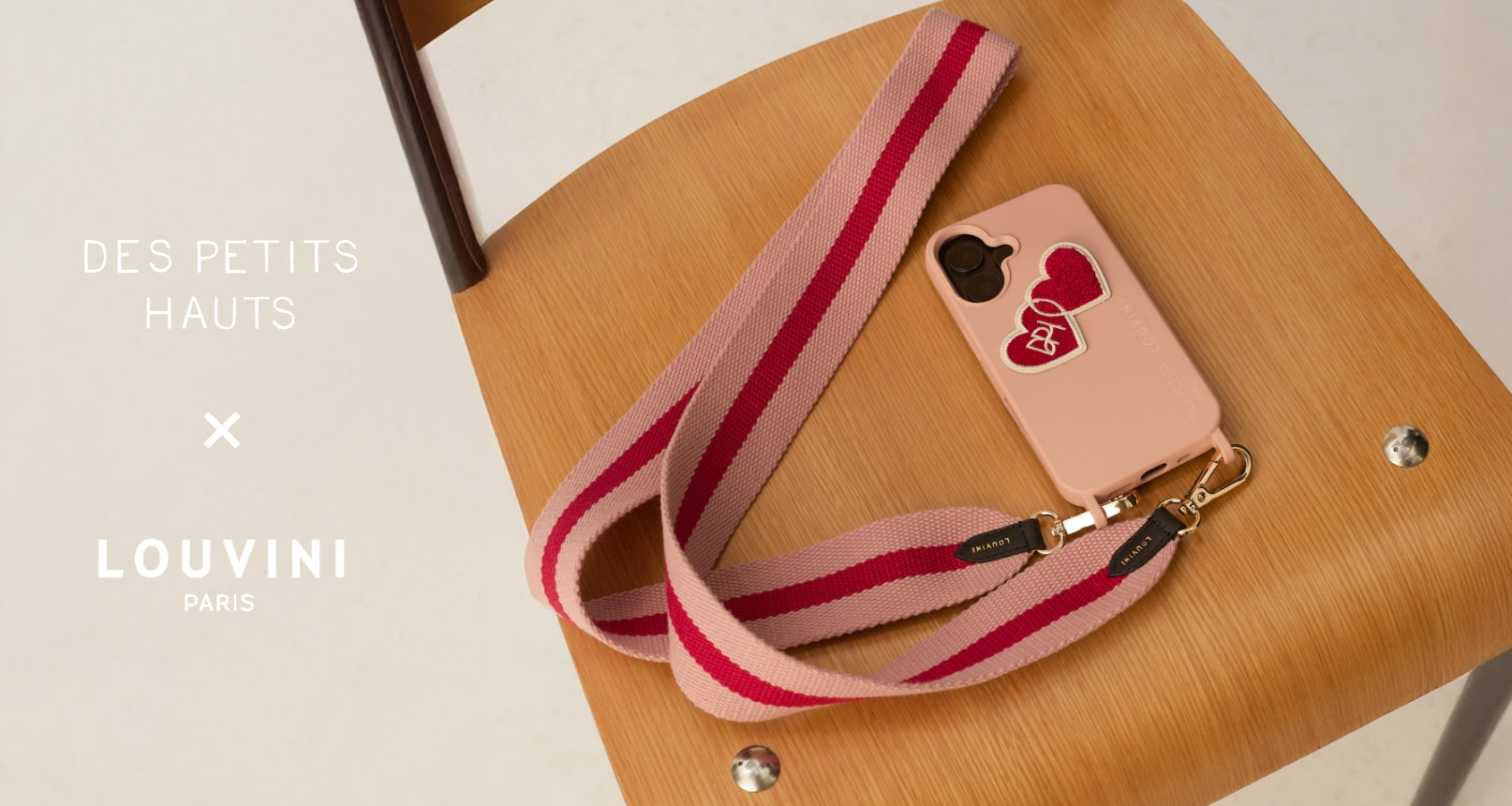 Pour célébrer nos 25 ans, Des Petits Hauts s’associe à Louvini Paris, la marque d’accessoires premium pour téléphones, et imaginent 3 modèles exclusifs co-créés : Une coque iPhone (disponible en 3 tailles : 16, 16 Pro et 16 Pro Max) déclinée dans notre couleur signature : le rose. Une lanière élégante assortie. Un sticker double-cœurs à coller sur la coque en personnalisation.