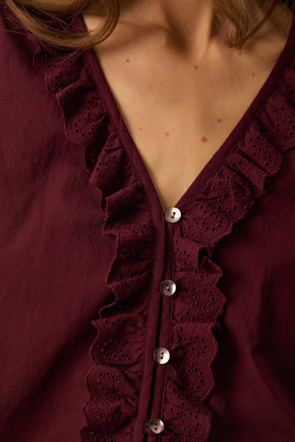 • Ruffled V-neck and tone-on-tone lace
