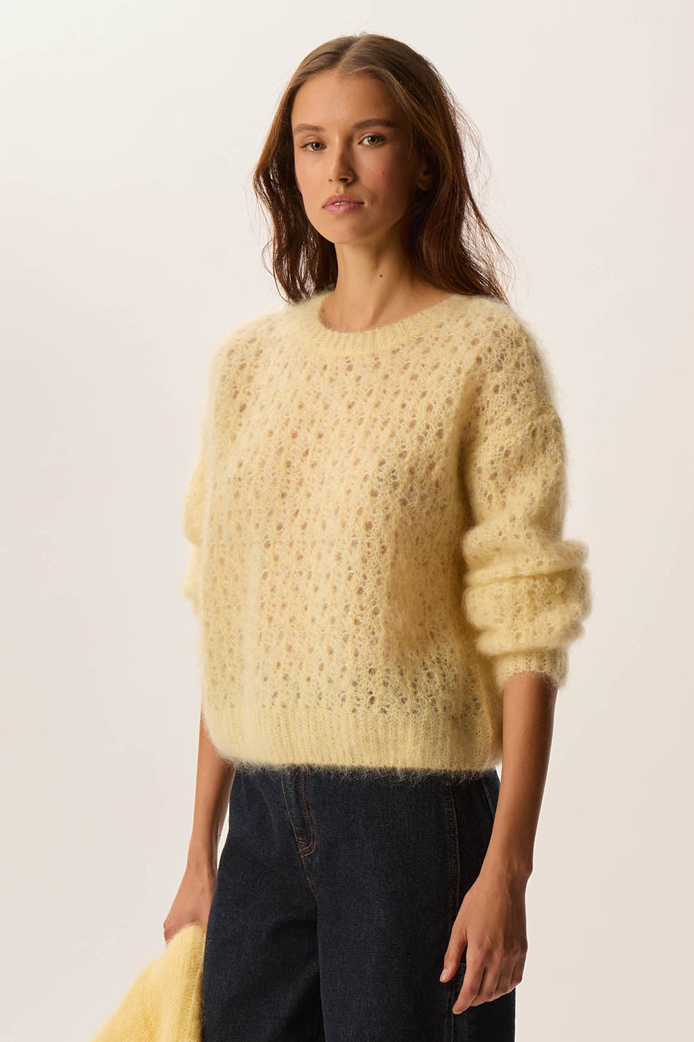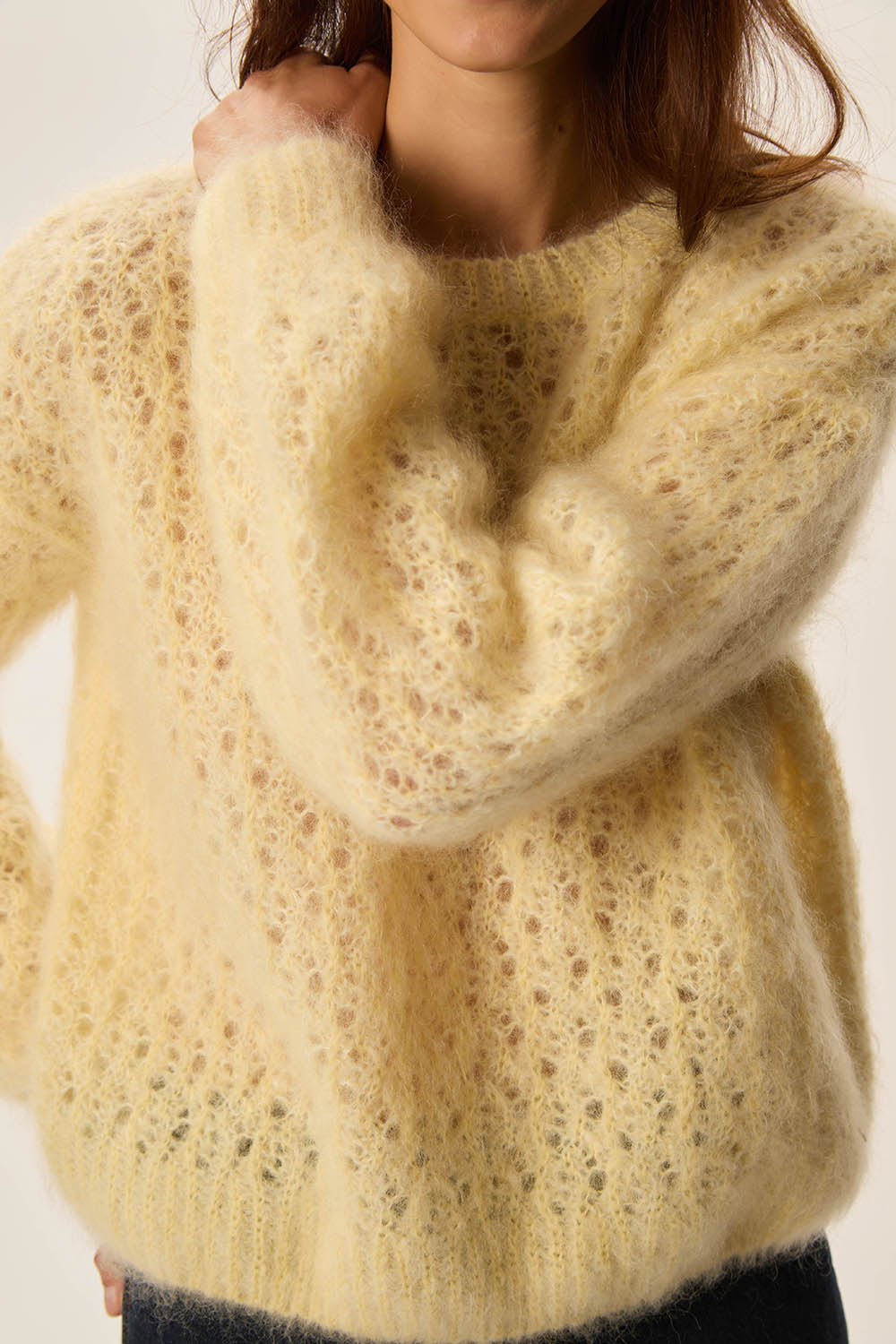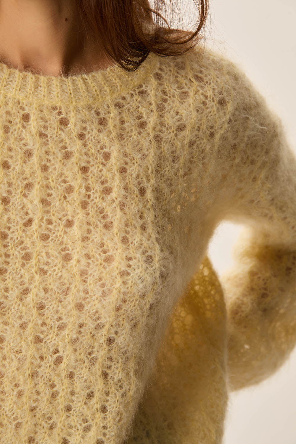 Pull maille ajourée en Kid Mohair et laine mérinos jaune clair