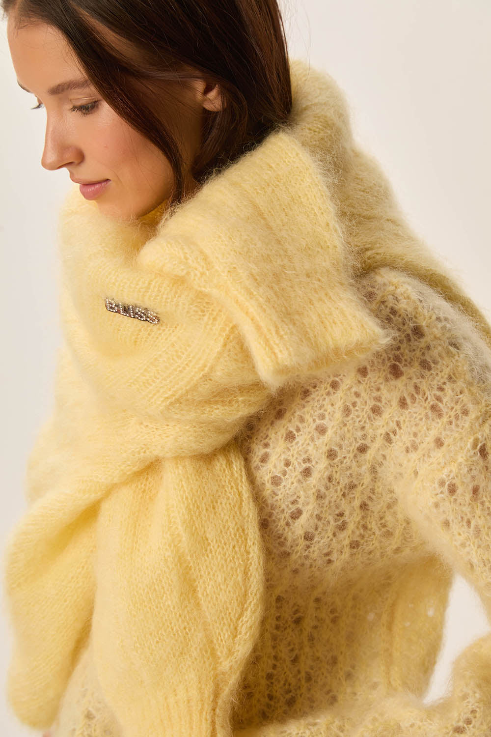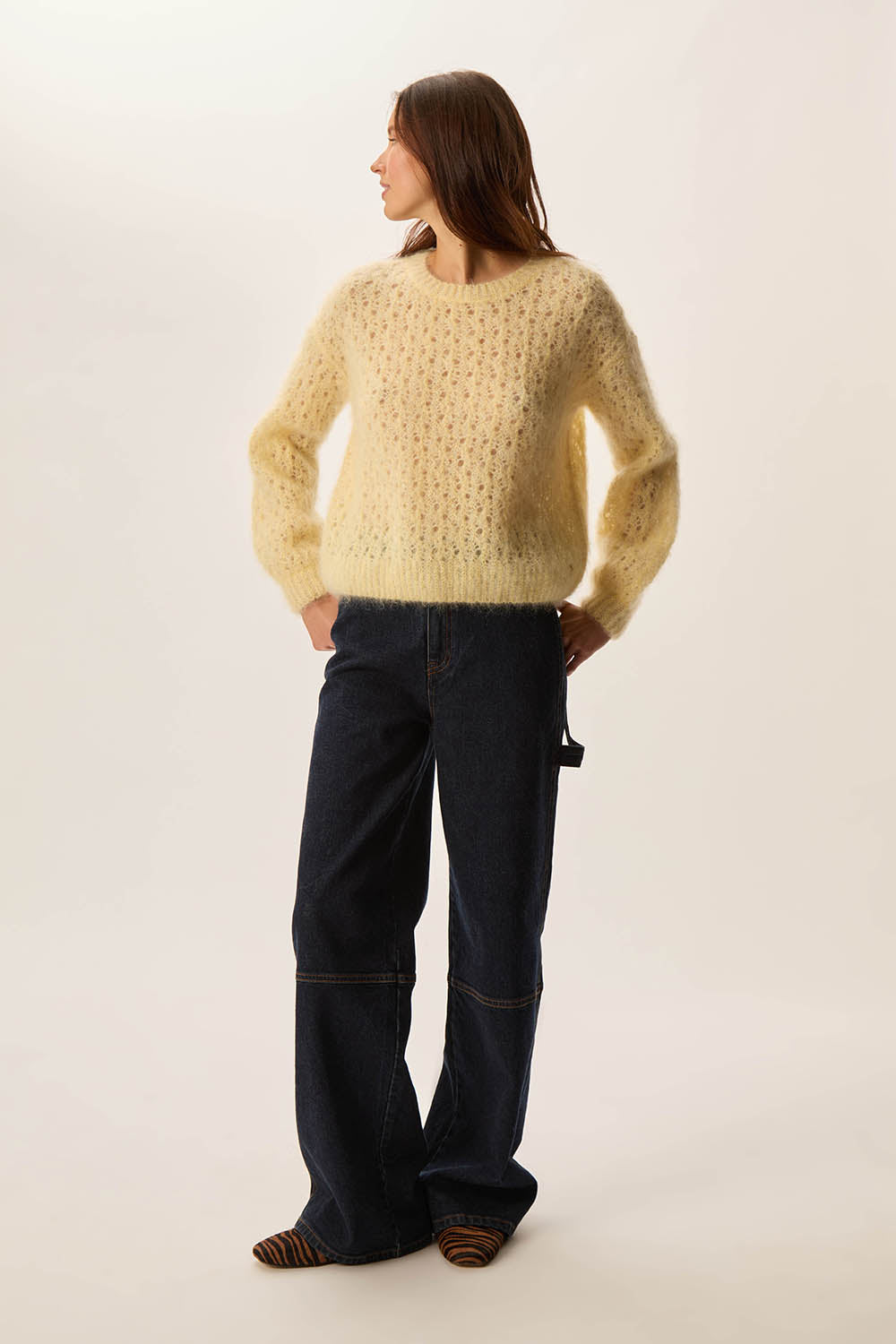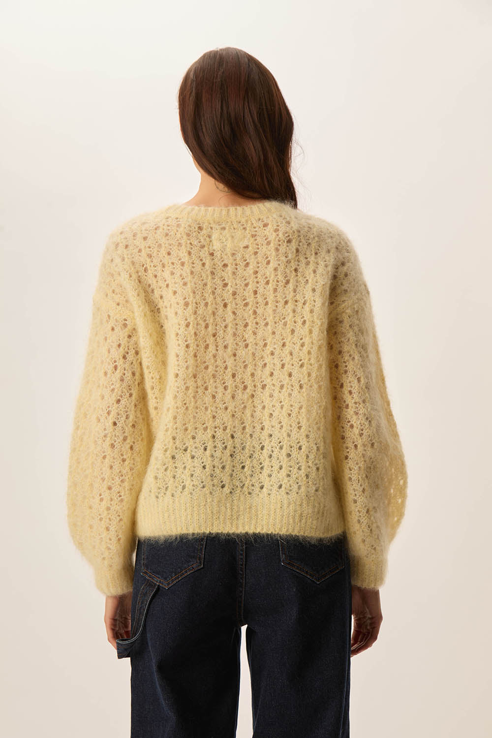 Pull maille ajourée en Kid Mohair et laine mérinos jaune clair
