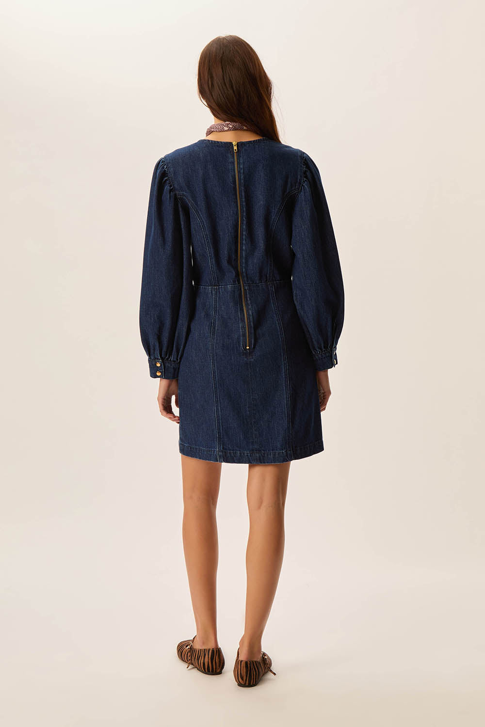 The Lais denim dress creates a chic look this season. In a boho, western-style vibe with untreated denim, eye-catching seaming and structured sleeves, this ultra-feminine piece can be worn with pointed boots for a cowgirl look.