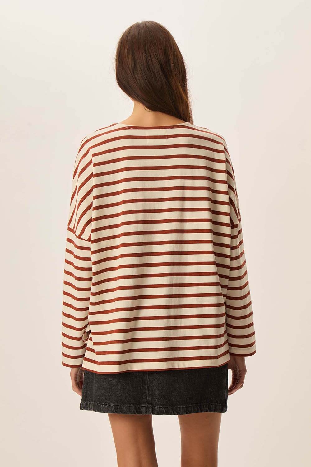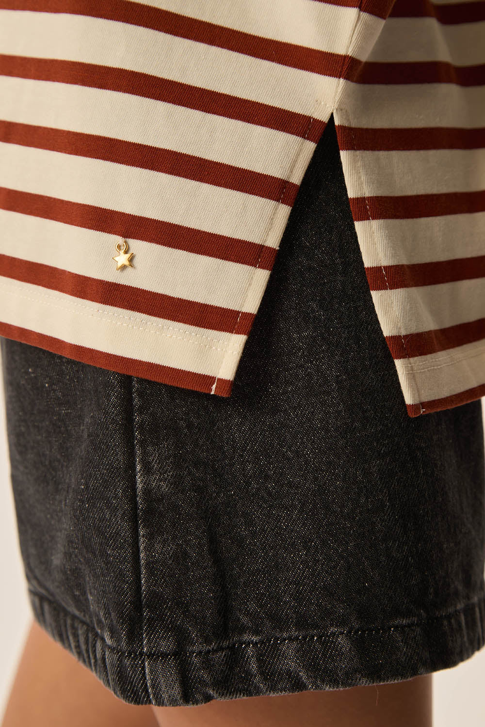 An essential piece at Des Petits Hauts, the striped top is still attractive season after season. A classic, iconic piece accessorised with a gorgeous brooch that varies depending on the colour.