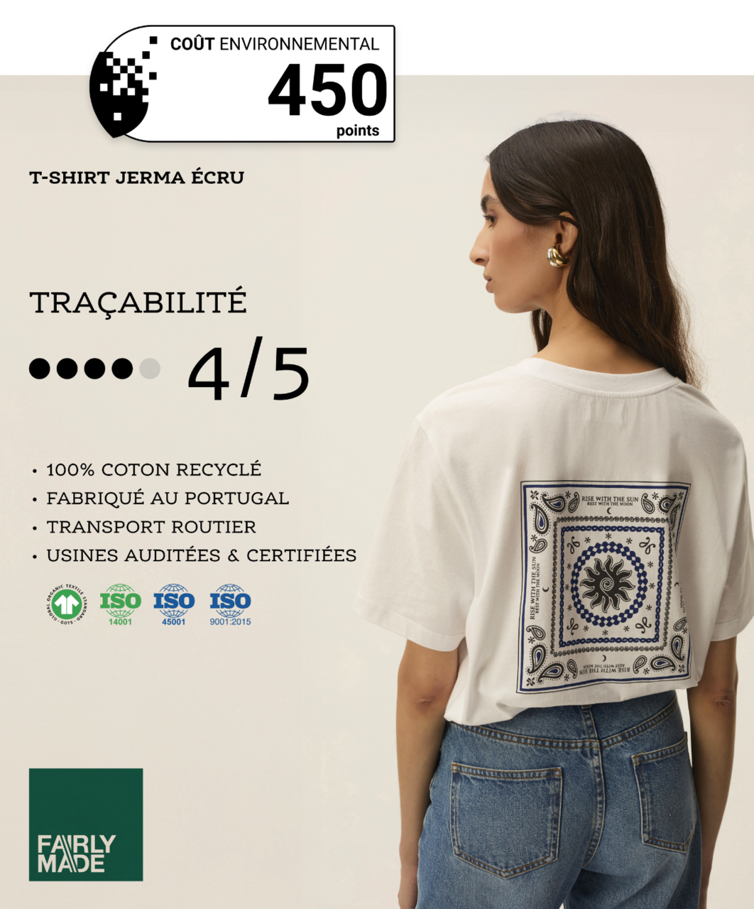 Retrouvez ici l'exemple de notre t-shirt JERMA Ecru, avec son score coût environnemental de 450 points