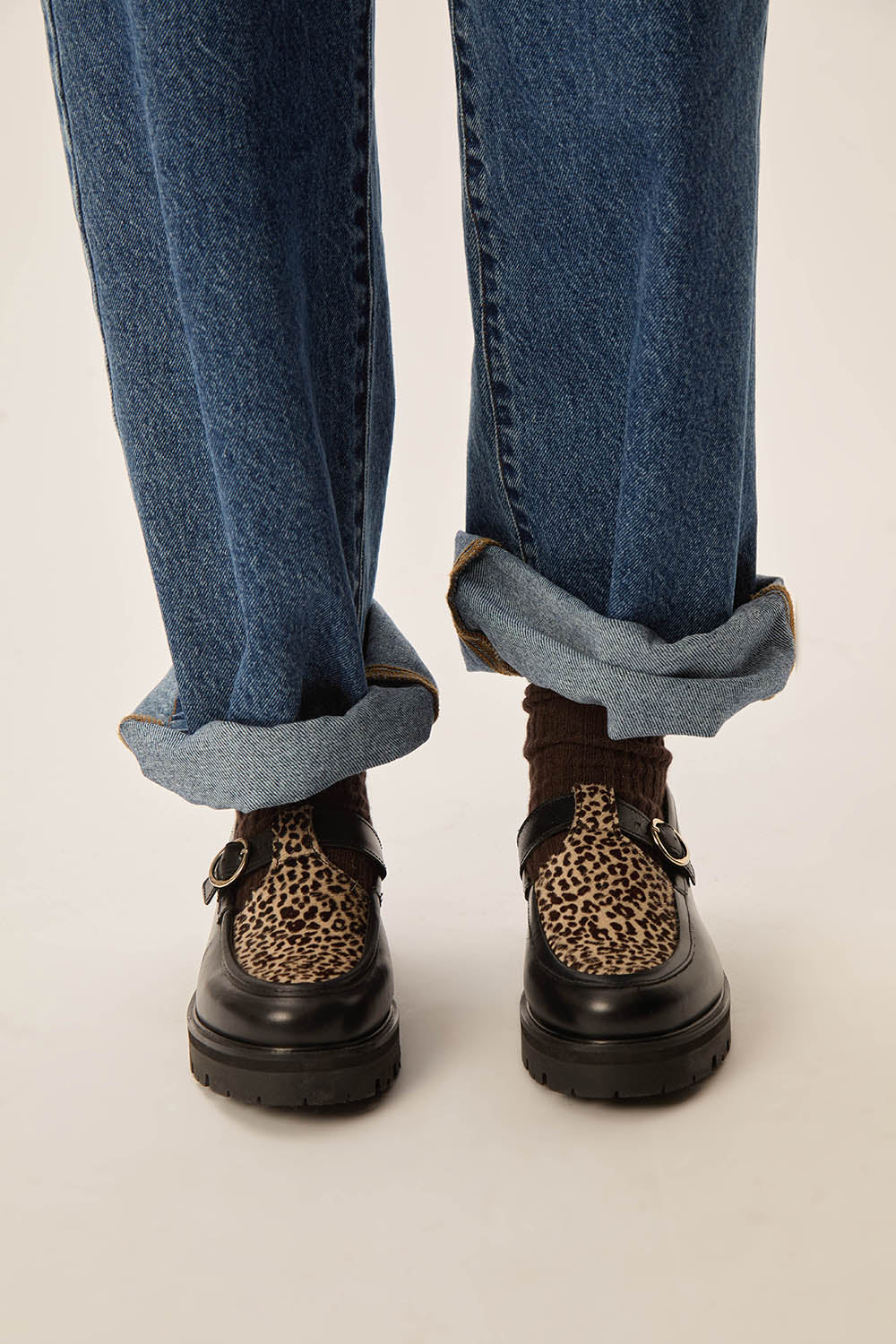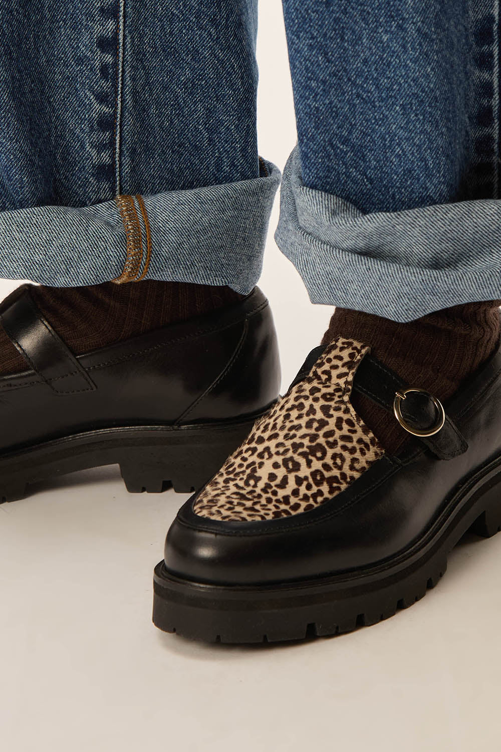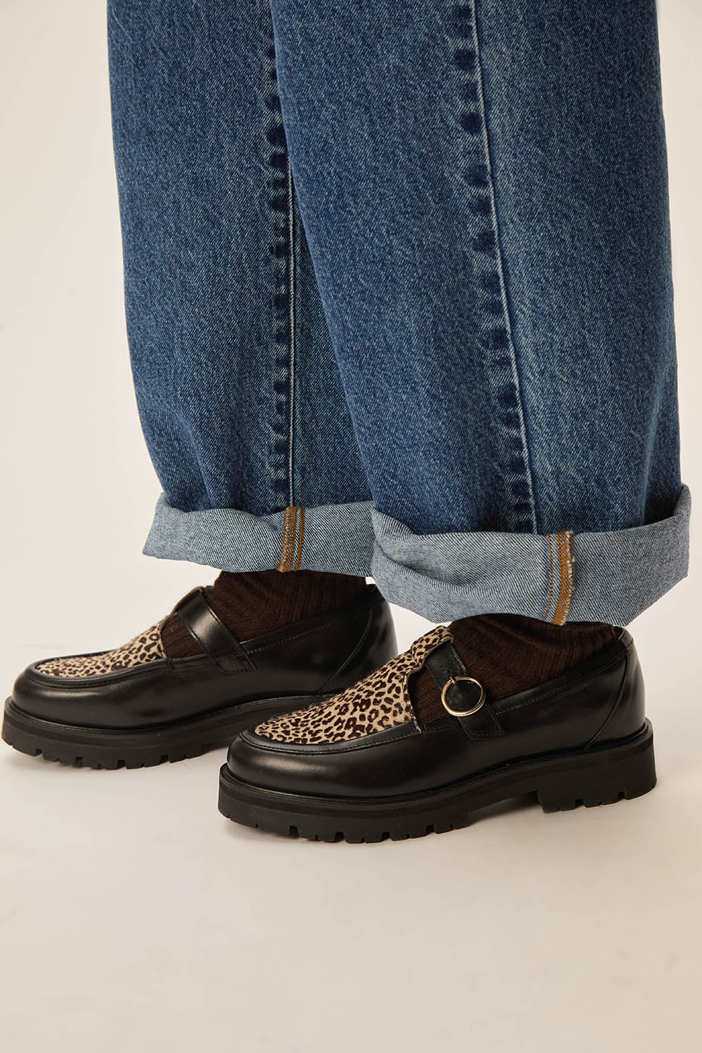 Jouant le contraste d'un cuir lisse et d'un imprimé dalmatien pour un look affirmé, les Mary Jane Phanou revisitent le genre avec brio. Montées sur une semelle creeper, elles feront immédiatement grimper votre quotient mode une fois aux pieds.