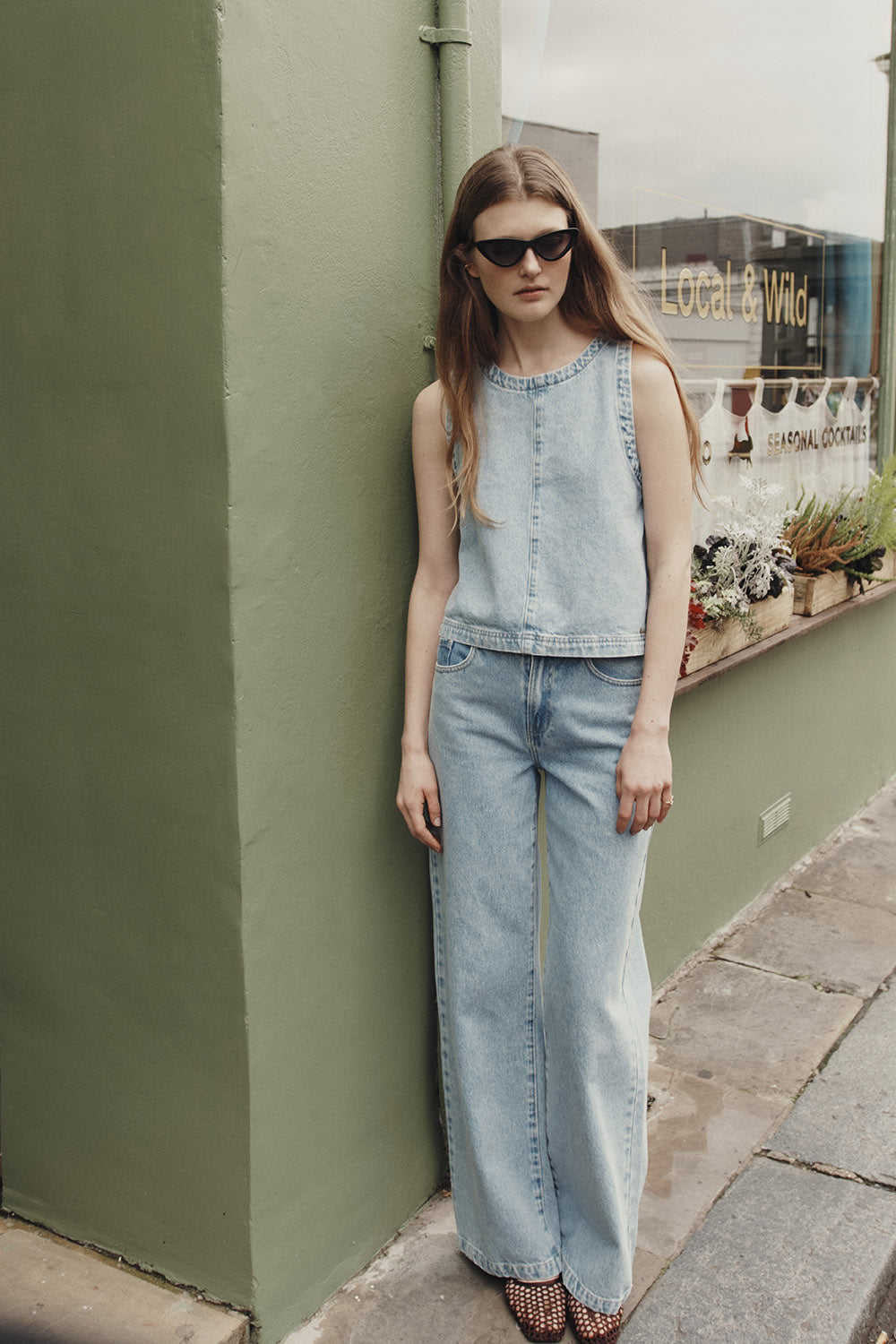 La ligne de denim est travaillée en collaboration avec une spécialiste du denim écoresponsable. Elle sélectionne des matières respectueuses de l'environnement et repense de manière éthique les traitements des tissus et la fabrication des produits.