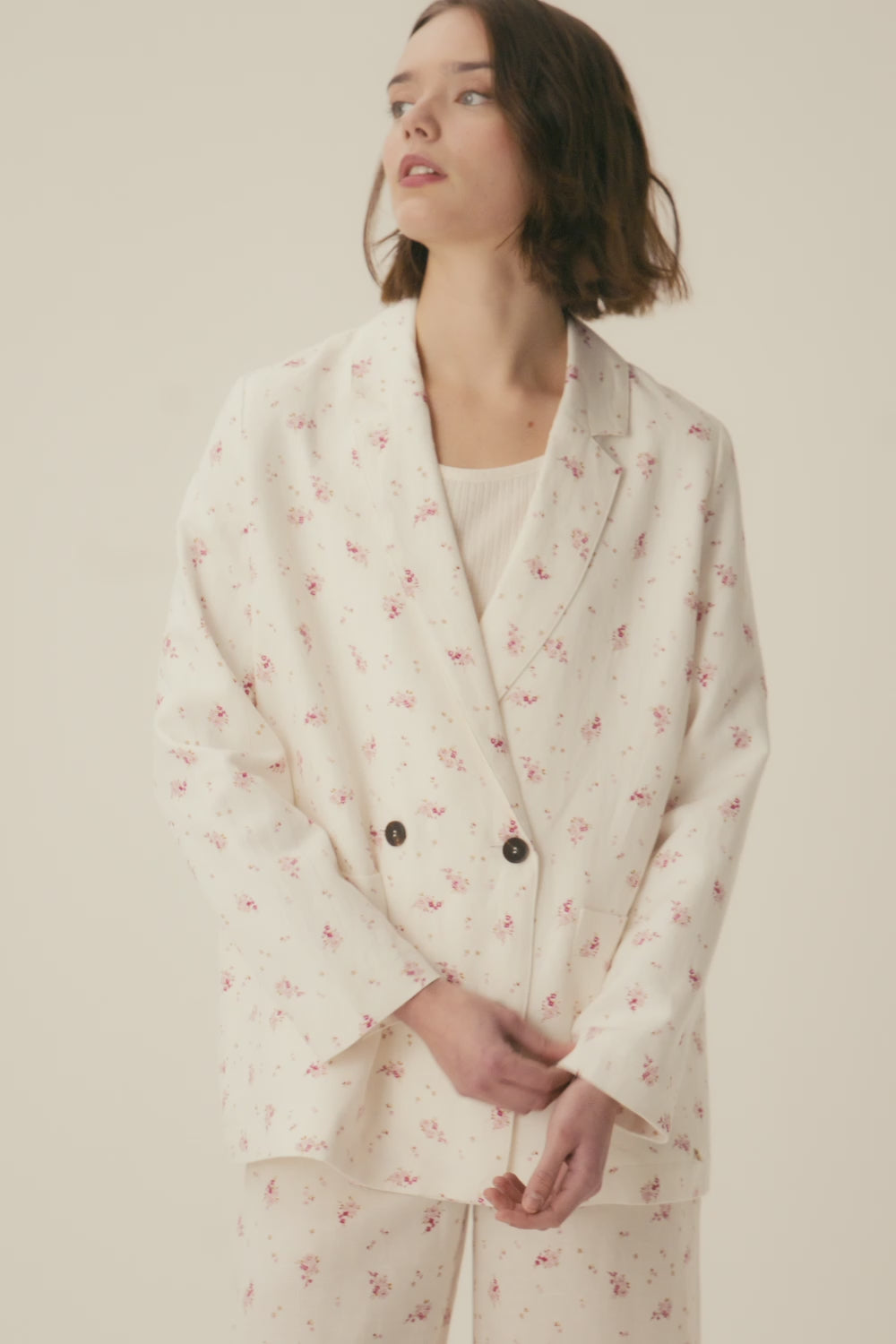 Une vent poétique et léger souffle sur la garde-robe estivale avec la veste de tailleur Simeone. Confectionnée en lin et viscose, coupe droite, double boutonnage et imprimé floral élégant structurent cette veste à porter seule avec un jean ou le pantalon assorti pour une cérémonie ou une garden party.